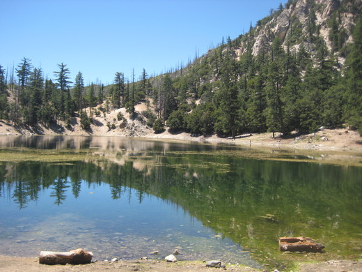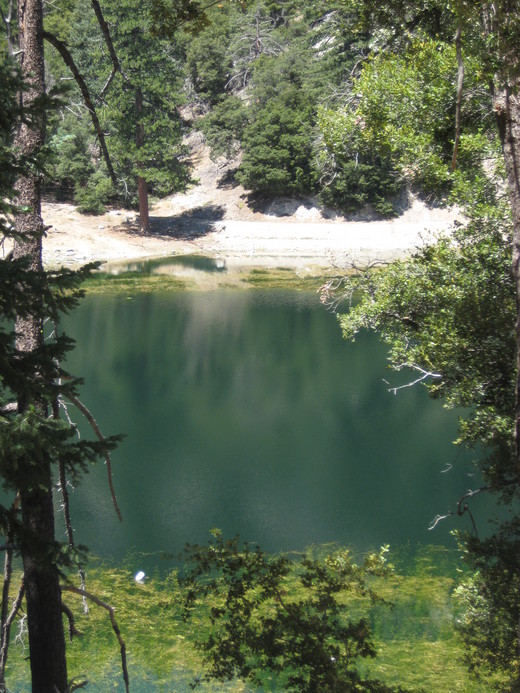 水晶湖(Crystal Lake), 是個在洛杉磯由雪水和山泉組成的天然小湖泊,因其水清澈如水晶而得名。(附注2) 夏天人們來此露營玩水,冬天來玩雪。 曾是熱鬧的消暑好去處。 在關閉期間,只有維護森林的義工可以出人此道。 可能因為才剛開放不久,還沒有很多遊客,彼得說很快的這裡又會是人山人海了。