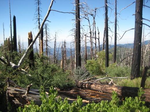 彼得學長一邊帶著我們上山前進,一邊介紹: 這段山路自9-1-2002年洛杉磯安琪山脈森林大火(2002 curve fire)後一直關閉到今年五月才悄悄地重新開放。(附注1) 腦海中馬上浮現,那一年,從我家遠望北邊山上一片火紅綿延災情的無奈心情。