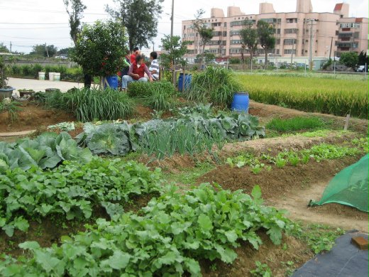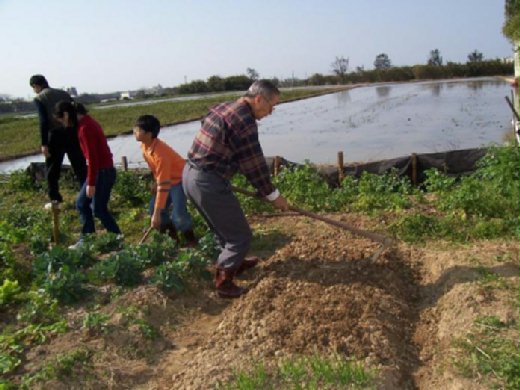 我們種菜的田,大小就像四分之一個籃球場,地雖然不大,但是種的種類還不少呢!有高麗菜、A菜、辣椒、韭菜、葱、蘿蔔、結球萵苣…等等。這些菜都需要施肥、澆水、除蟲、除草…,但這些工作都是由有經驗的大人去作,我只要在旁邊跑跑腿、吃吃喝喝,去鄰居家裡打球或和他們玩就好了。