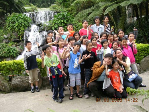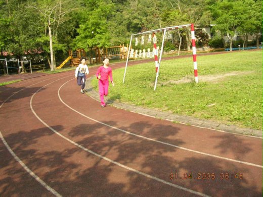 早上我到學校晨練,7點到9點,到那邊已經快要中午了,我們到[有木國小]校門口前時,前面有長長的階梯,全體小朋友在階梯兩側排成兩排迎接我們,他們學校全校師生只有110人,我們學校老師就跟他們一樣多了,