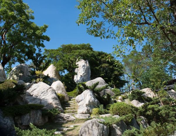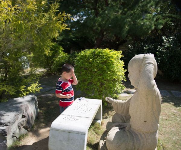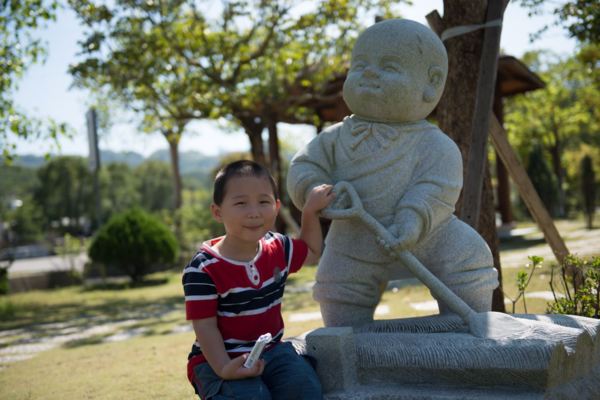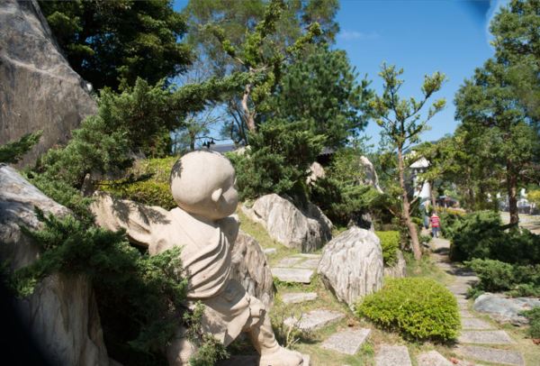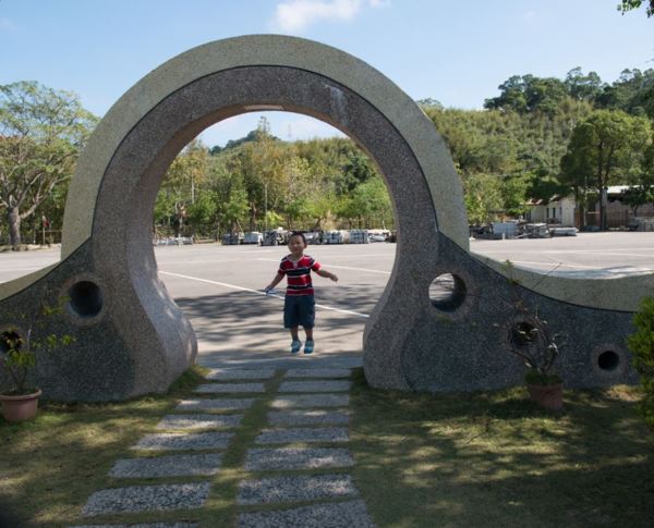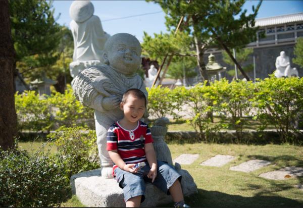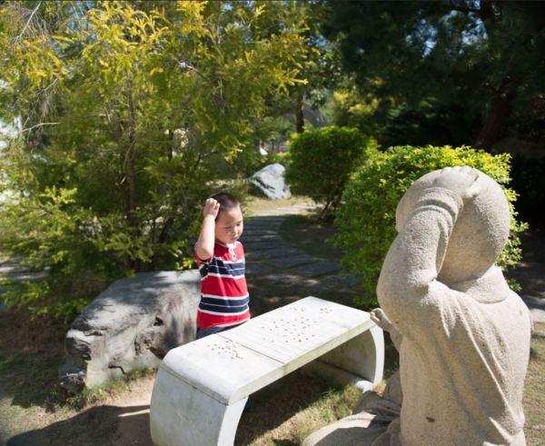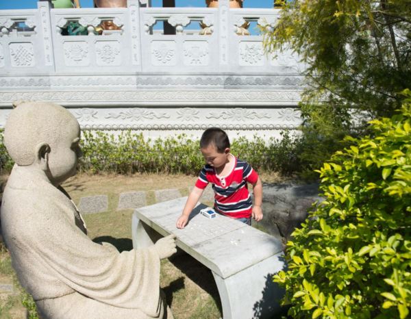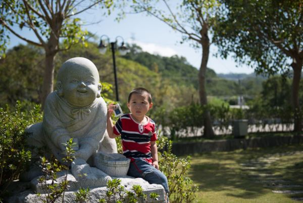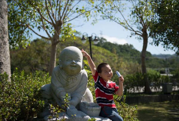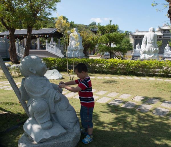 接下來繞到外面的小小公園吧。宇兒和小沙彌的互動很是好玩。也是莊重之中的放鬆吧!