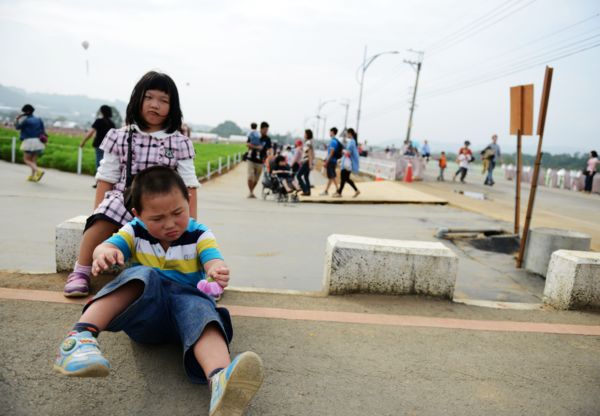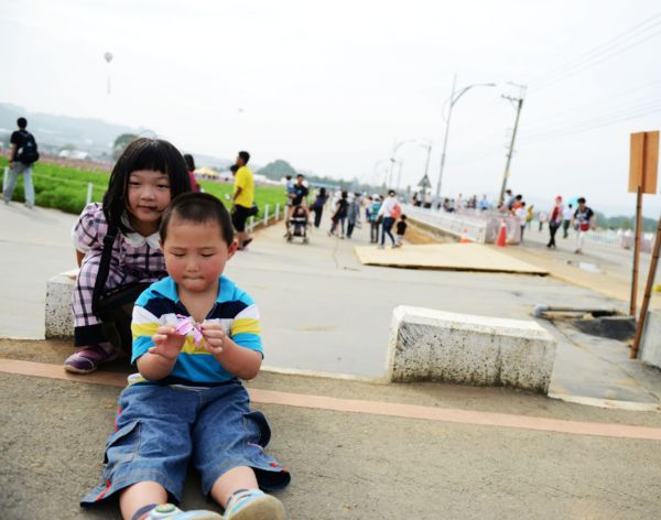 人太多了,2個孩子還是鬧脾氣了!好累好熱哦!弟弟不知道從哪撿到了折斷的花兒,