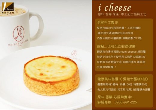 有幸,最近吃了幾塊[不用反式脂肪]做的糕餅,不但滿足的口慾,對身體也嘉.還有醫生保證,因為做iCheese愛起士乳酪蛋糕,製作人正好是一位醫師.