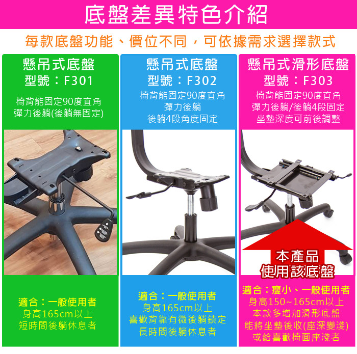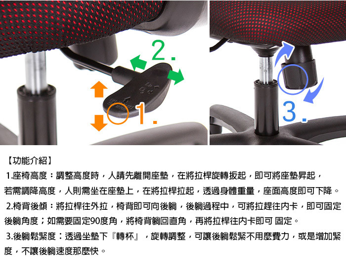 基座:椅背可固定90度、後躺四段式固定、座深調整
