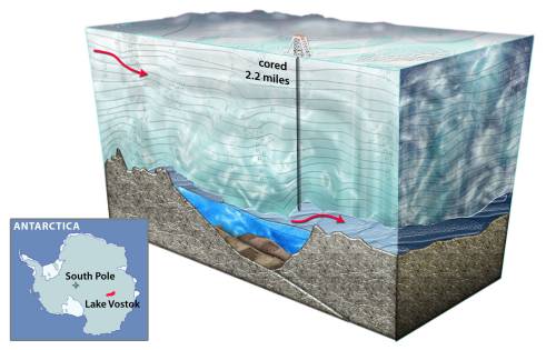 28-Junio-2007: Una visión artística del lago Vostok, enterrado bajo el hielo antártico. Los científicos están averiguando cómo entrar en él sin contaminar su entorno. (Foto: Nicolle Rager-Fuller / NSF).