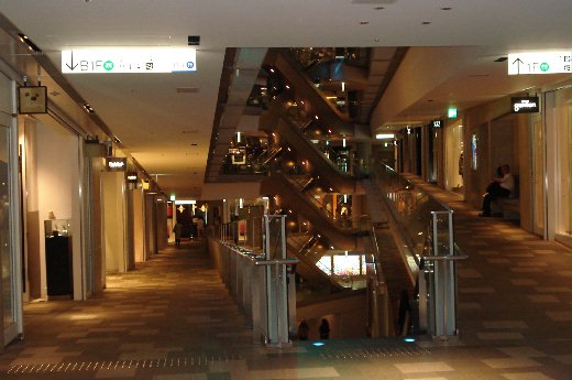 從澀谷可以搭乘銀座線或半藏門線等地鐵到表參道站,表參道站是各國名牌商品所在,出站不遠有棟建物「表參道Hill」,精品沒啥興趣也買不起,但倒滿想參觀一下建築物,進入「表參道Hill」才發現的確是有些與眾不同,環成圈形的走道,以斜坡構建繞圈而上,只有一端設有電扶梯,以方便逛累的顧客,圈形中央透過投射影像作用,讓顧客有若置身在深海一般,不像一般百貨公司講求明亮的設計。