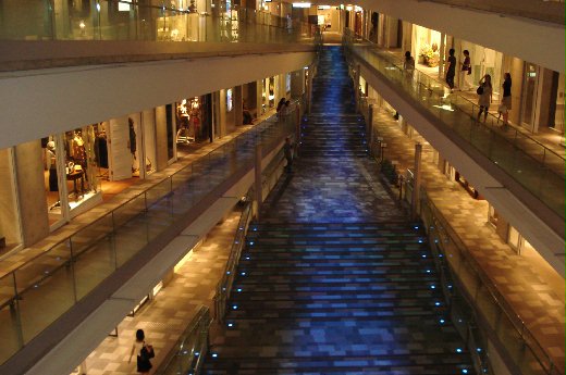 感覺它動線規劃的非常特別,尤其樓梯打上藍色燈光靠著影像的流動作用,讓顧客有若置身在深海一般,這特殊的走道設計和金碧輝煌的櫥窗設計,想必讓人逛起來心曠神怡,不知不覺更上一層樓,不得不佩服這建築師的鬼才!