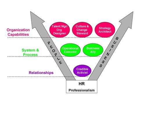 Dave Ulric在「HR Competency」這本書裡,提出一個整合的人力資源角色的模型「模塊」( Model),它是以人力資源的專業技術為基礎(Professionalism),同時向企業需求(business)與員工需求(People)兩個方向分別展開,涵蓋了人際關係(Relationships)、系統流程(System & Process)、組織能力(Organization Capabilities)等三個層面,而HR分別在這三個層面,必須扮演可靠的行動者(Credible activist)、作業執行者(Operational Executor)、企業夥伴(Business Ally)、人才管理與組織設計者(Talent Mgr & Org Designer)、文化與變革的管理者(Culture & Change Steward)、策略規劃者(Strategy Architect)等六種角色 (詳如附圖) ,而這幾種角色也確實與目前HR在組織所必須肩負的職責不謀而合。