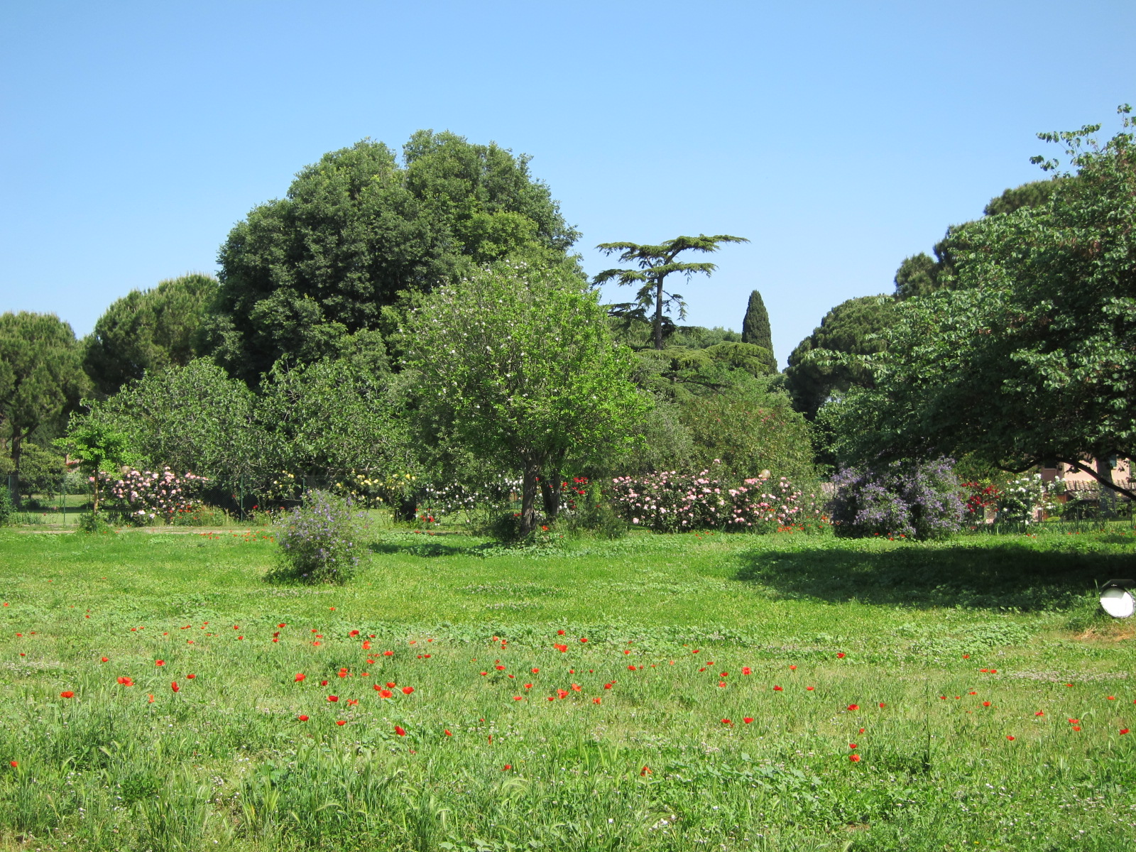 計畫行程時,我們說要順便去看古城牆,於是搭地鐵到S.Giovanni站下,便開始走路,經過Basilica di San Giovanni in Laterano時,看到有拉繩子,圍棚幕,及荷槍的警察,便趕快順路走下去,這一走就走到卡拉卡拉大浴場,光看圍牆就很高,真不知古羅馬人為何把個公共澡堂蓋這麼大,為了宣揚帝國國威嗎?先不進去,我們的目標還是在Via Appia。在路口看見通往Appia 古道的標示,也有一些人在那裏走路,我們就跟過去了。一開始,古道兩旁有些大宅院,用高牆圍起,沿途都是素馨的香氣,某國的大使館也設在這裡,在羅馬當大使挺不錯的,使館都在最美麗的地方。