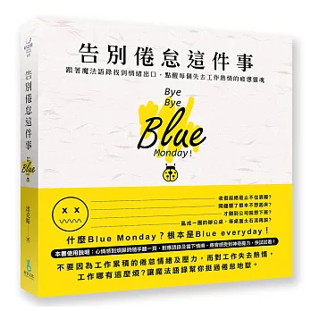 工作倦怠人人有,當感受到倦怠及壓力時,其實也是調整工作方向的機會,但千萬別讓自己陷入「重度症狀」而傷心又傷身。本書提供71則掃除倦怠、減緩工作壓力的魔法語錄,當感到壓力來襲、情緒無法負荷的時候隨手翻一頁,讓魔法語錄提醒每個疲憊靈魂――其實工作沒有那麼煩!