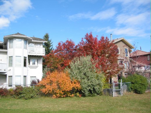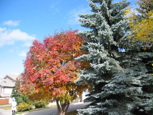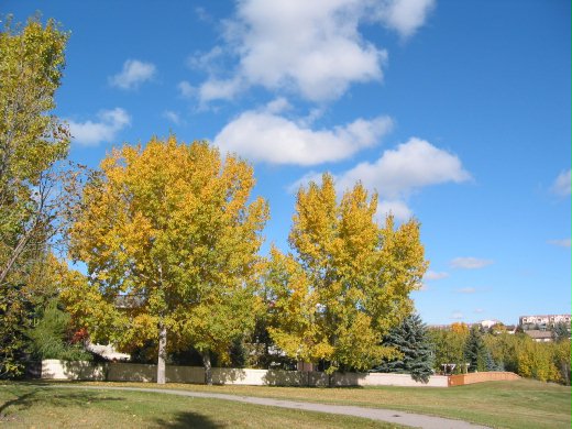 天氣轉冷之後,七葉樹的葉子幾乎快掉光了。其他的落葉喬木,如卡加利的市樹 - 榆樹 (elm) ,也相繼變成金黃色 ,而慢慢地凋零。另外,在河畔、山坳上和公園裡隨處可見的白楊樹 (poplar),更是全面地變黃,與常綠的針葉樹成了強烈對比。