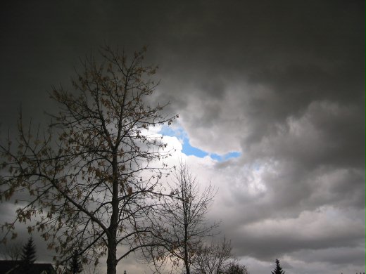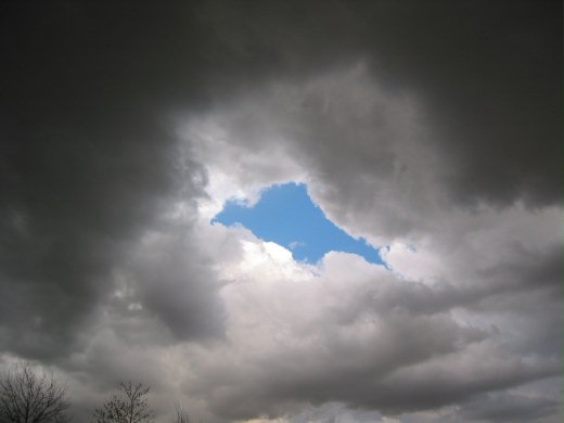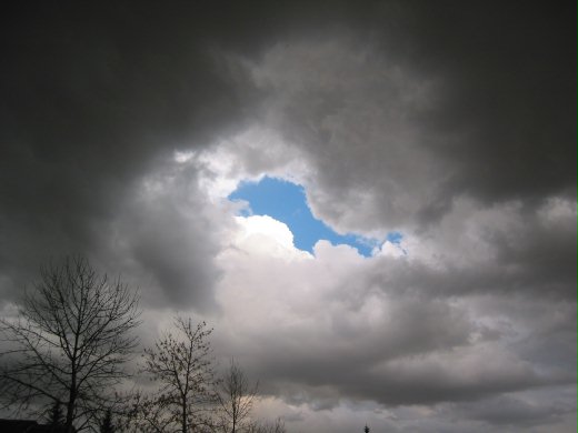 我喜歡看天空的雲彩變化,一年四季從日出曙光到夕陽餘暉,都可以捕捉到美侖美奐的穹蒼。 那天,近傍晚時,如同平常一樣帶著狗兒去散步,看著原來帶有粉紅和藍色的天空被好多朵黑雲塊圍起來。俄頃,強勁的高空氣流很快就把整個天上的灰黑色雲彩連結起來,僅僅露出了一小塊藍白色的空隙,真像開了一扇窗戶。
