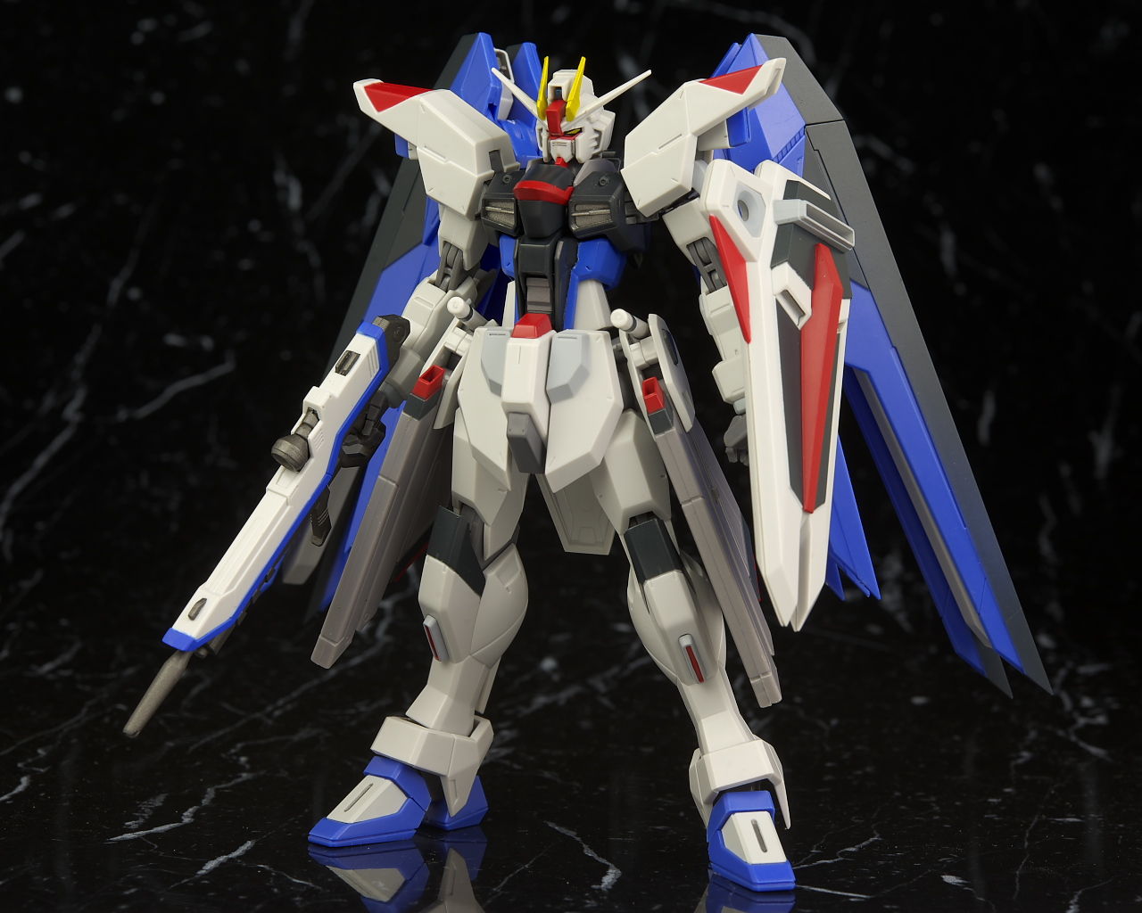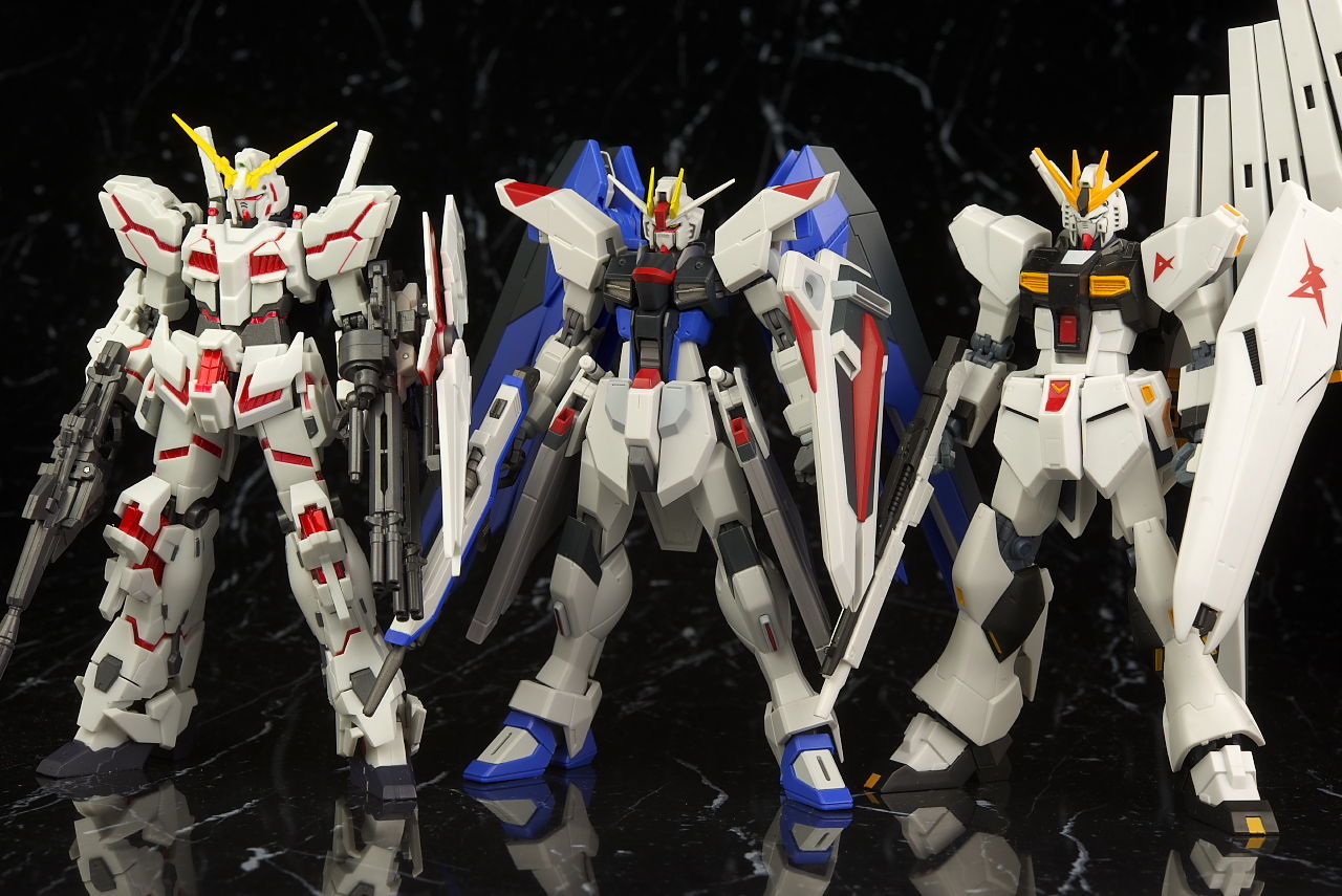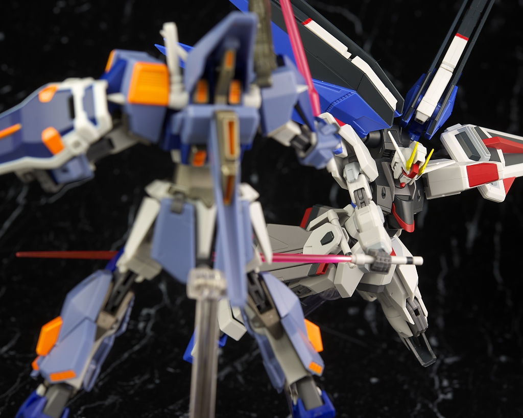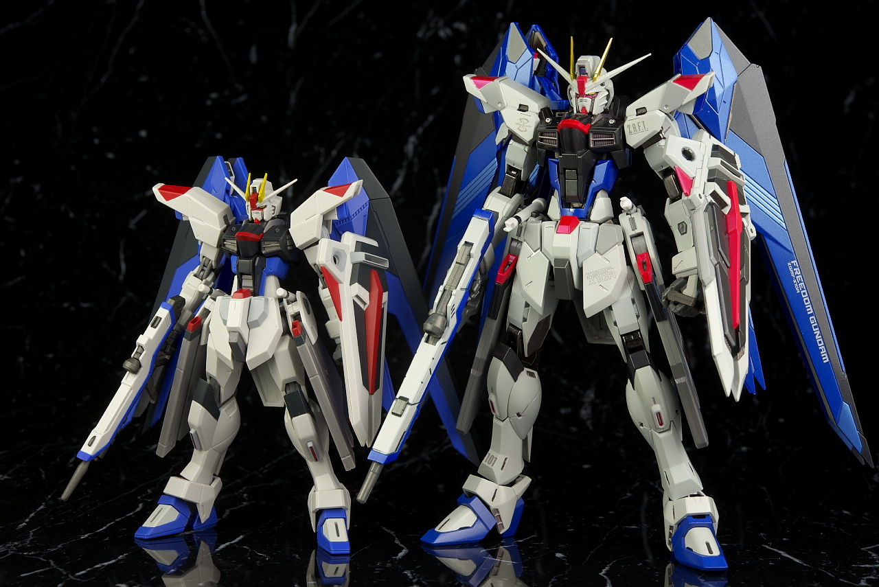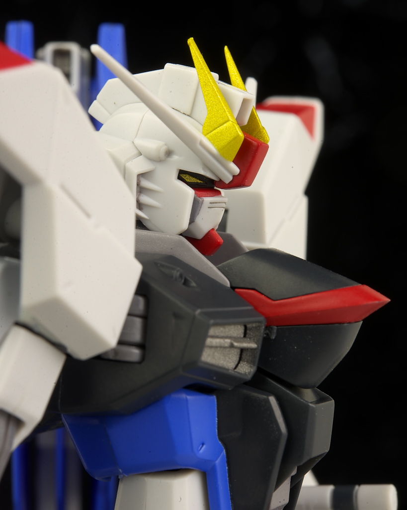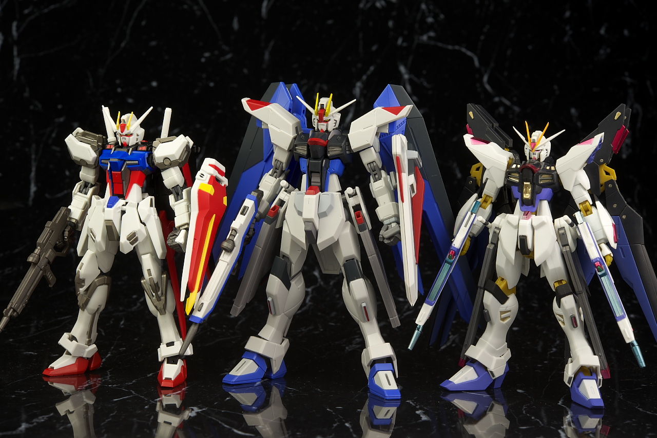 ストライク、ストライクフリーダムと並べて進化の系譜。今回からかなり大きくなりこれまでとの統一感はほぼなし。