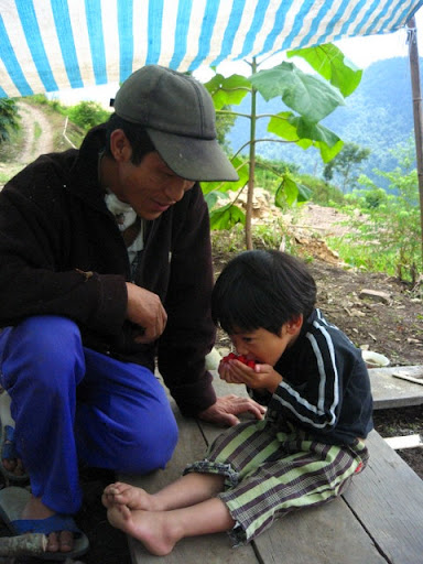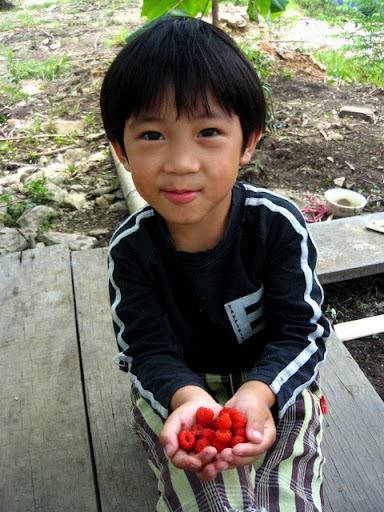 (因癌症之故,必須氣切裝上管子才能說話的卡灰,摘了好大一把懸鉤子給小兒子解饞。那是塔悠最愛的「野草莓」!)