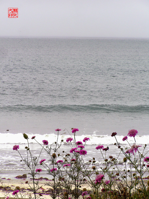 離去前,妹夫在停車場邊的水龍頭下洗他新買的魚,大家耐心地等著。旁邊大石塊亂壘成的破浪堤岸上,紫紅色的野花開底喧鬧。我席地坐了下來,從野花間隙中向大海望去,瞇細了眼,讀著這天色、這近處的海和這遠處的海所各自呈露出來的不同灰色調;而風仍然從大海裡不停的向我吹來。山這頭的雲層慢慢地散去,太陽似乎快要出來了。