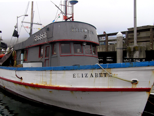 我們從旁邊的梯階走下去,和買好魚的那幾個人正巧碰上面。提了裝魚塑膠袋子的男人和我打著招呼,然後就在窄狹的碼頭小通道上,各自側了身子走開。我們經過伊利沙白舷邊,才發覺了她的憔悴和陳舊。越南漁夫站在船裡前頭,手裡拿了罐啤酒,臉上紅艷艷的已有微醺的酒意。船後的船舷短欄上,坐著另一位漁夫,戴頂帽子,穿著黑夾克,安靜地抽著煙,面上顯露著上了年紀的滄桑和疲倦。