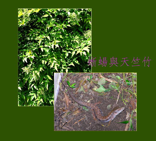 我原以為是條大蛇,後來見了它的腿,方知是隻蜥蝪,從我蹲的處所不足三尺的地方,無聲無息地已不知道注視了我多久。知覺我發現了它,這一尺半長,五、六公分直徑粗細身子的爬蟲,卻仍在那裡歪著頭,毫不害怕地繼續和我對望著,絲毫沒有要退走的意思。我給它照了幾張相,進屋裡去喝了杯水定定神,又坐了會兒,再出來時方才沒有見著它的身影,可我心裡反倒有點寄掛,不知它走哪兒去了。