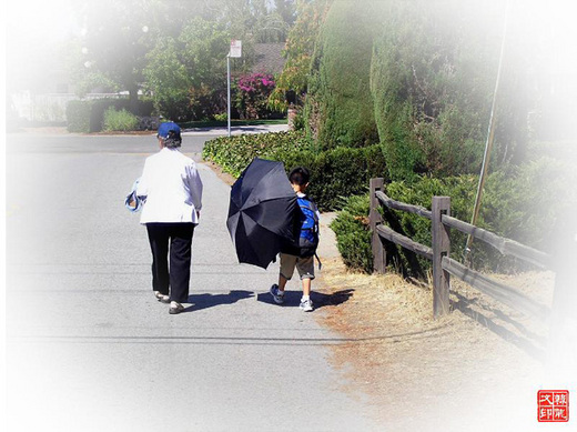 日子裡有太陽時,婆婆和孩子就會各自打起了一把傘。不過當日頭不大時,婆婆偶而會戴頂棒球帽子,傘那時她就不用了;但是孩子這傘婆婆是定要他打著的,縱使那日頭實在是不算大,傘用不用其實是都無所謂的。