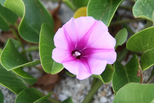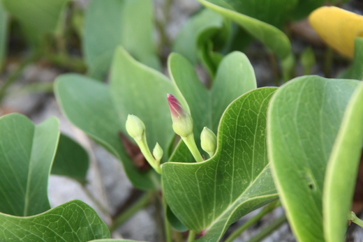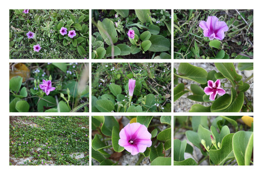 在眾多的海濱植物中,馬鞍藤的花朵最大、最鮮豔。由於與牽牛花同屬旋花科、牽牛屬的植物,馬鞍藤的花朵跟牽牛花長得有點像,但它長在海濱沙灘上,不像牽牛花纏繞攀爬,而是趴在地上蔓生,向四面八方擴展地盤。馬鞍藤不怕惡劣環境摧折的好本事,可以忍受烈日曝曬、海風吹襲、潮水拍打,並在貧瘠、養分缺乏、含鹽分高的海邊生長。它的名字由來,是因厚厚的葉片長得像馬鞍一樣。在其他植物無法立足的海濱不毛之地,只要有馬鞍藤的種子落地發芽,就可期待一片綠意出現。馬鞍藤的生存技巧很高超,採用地遁法,以蔓生的莖向各方土壤分枝擴散,只留下有角質保護的葉片在地面上,其餘的莖節都往地下發展,減少水分蒸發、防止灼傷。 |