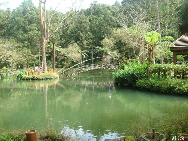 一泓碧綠的池面上, 因弧型的橋面而柔化美景. 而溪頭林場也不餘遺力的 每年更新保護遊客的安全. 這會兒正碰上 施工忙, 就遠遠的欣繞了一圈 欣賞懷舊吧.