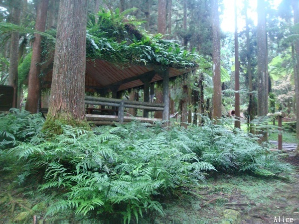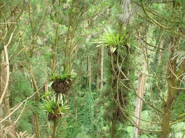 成片森林 蕨類植物豐富, 有生長在路旁的, 也有盤踞在樹幹或涼亭頂上的鳥巢蕨.