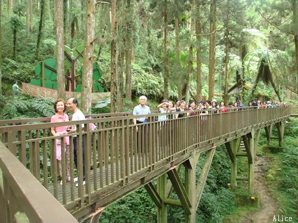 七層樓高的木質走廊以杉材架高,聳立架掛在樹冠間. 在樹梢賞景就是不一樣, 人變高了, 和森林接近了, 高掛樹梢的鳥巢蕨也近了.