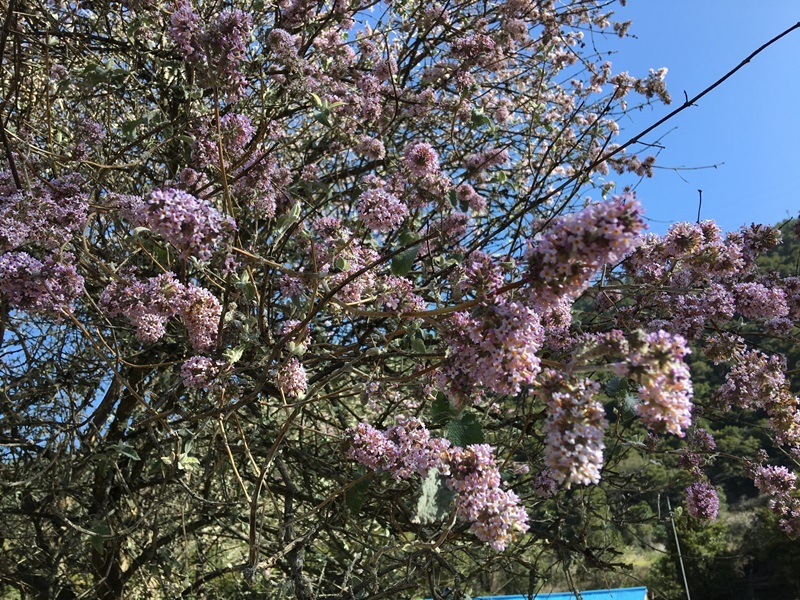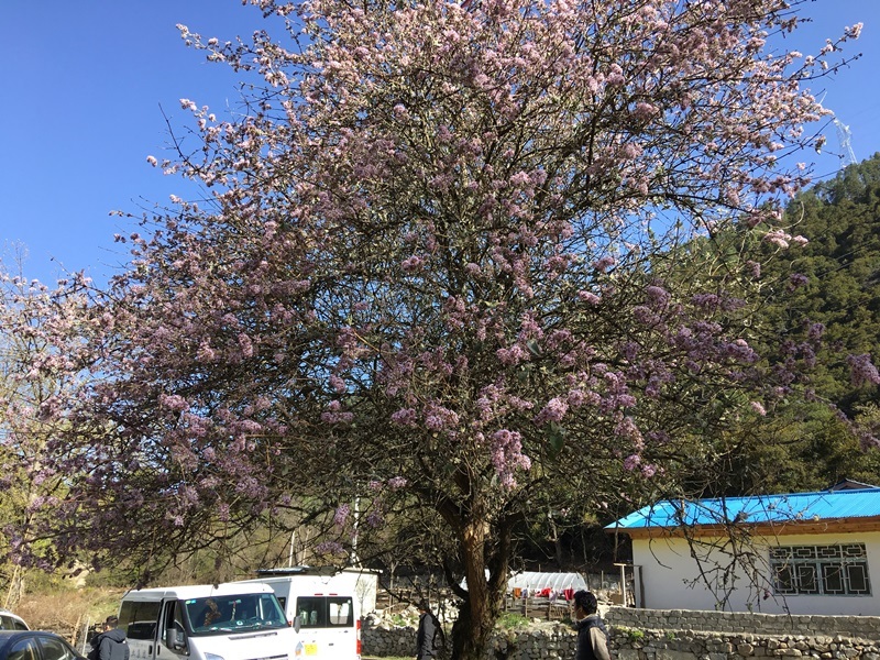油菜花田的農戶家,門前也有一株盛開的粉色花樹,樹形像似櫻花 或美國櫻花,花朵卻像 細細碎碎的丁香,只是沒有香味。語言隔閡, 問不出名稱來, 只能看開心了。