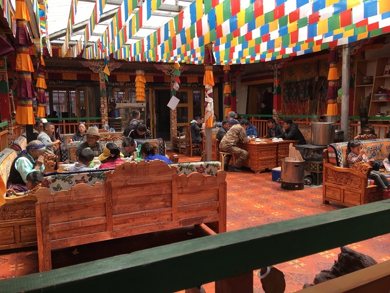 見到藏民們舒適的在陽光下的中庭餐廳用餐, 很是羨慕。(我們因為選擇坐在室內,熱茶熱飯還沒有來 ,相當清冷,內外溫度相差有五度多。)