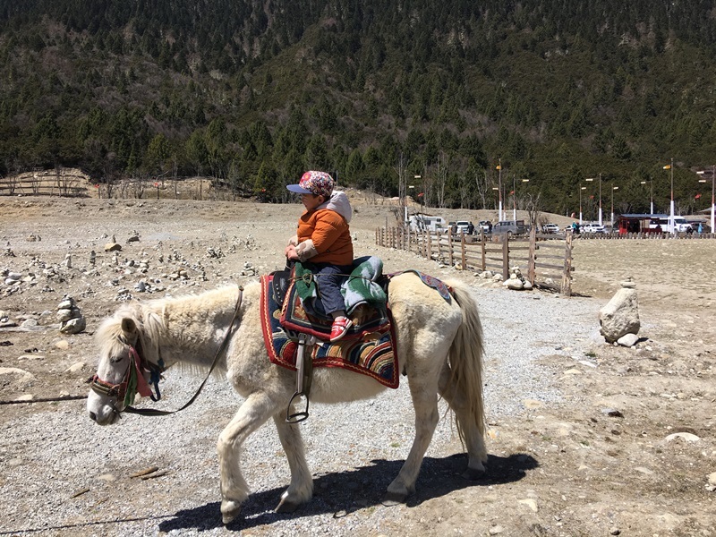 這個魯朗的湖邊的洗手間 雖因鎖住無法使用,看到精心打扮的馬匹 有小孩兒騎乘,馬伕自己騎了通往繩索橋,往魯朗國際旅遊小鎮走去,襯著雪山 湖水 瑪尼石, 很是賞心悅目。