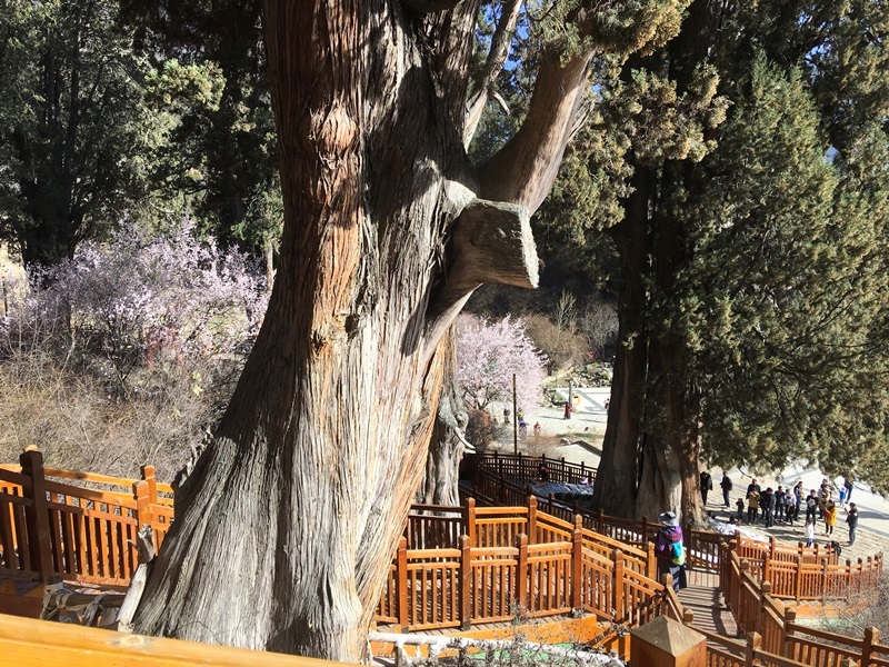 下一站是 樹齡上千年的雅魯藏布江的巨大柏樹林。 入口竟有一大片梨花。 來西藏賞桃花的,竟能遇上梨花, 可不是 喜事連番至。