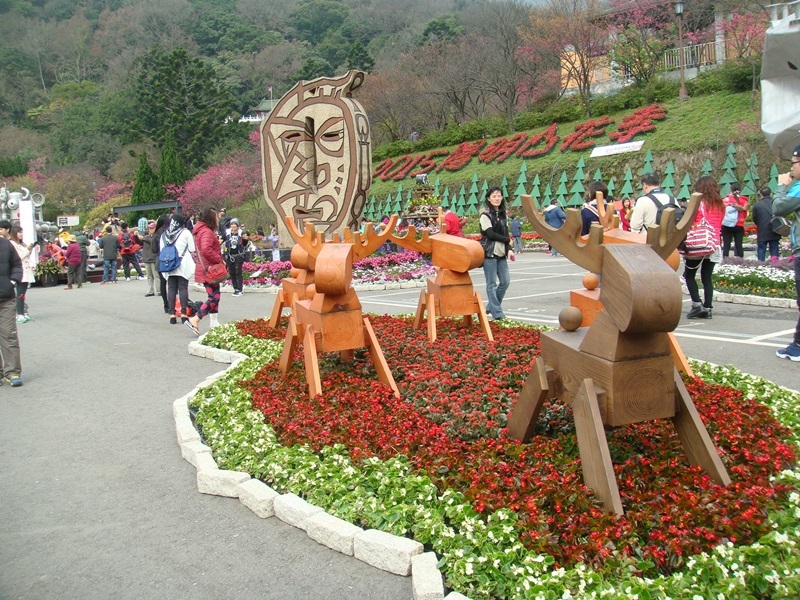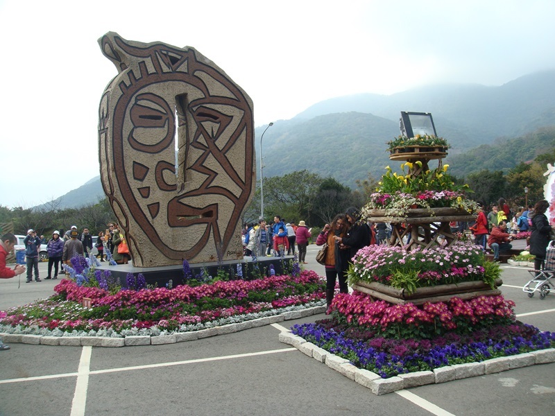 上方的2015陽明花季登場了, 廣場上的表演台 有直笛正吹奏著。廣場上吳弦三的雕塑與彩色的花壇妝點著。