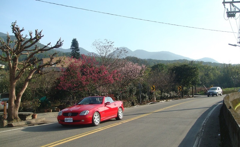 北新路101道上同一磁磚廠 也有些櫻影, 對街賣地瓜的花園裡, 又見山櫻花與紅粉佳人並艷。聽說三芝與淡水的櫻花一月份開完了 。駕車 遨遊在美麗的青山間賞花, 應該也很愜意吧。