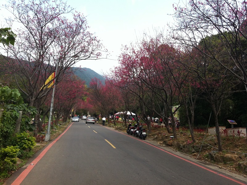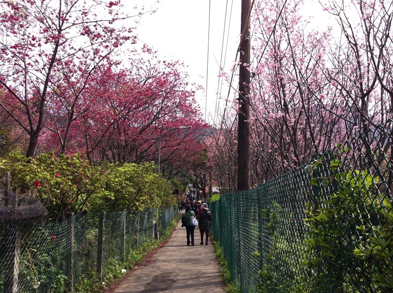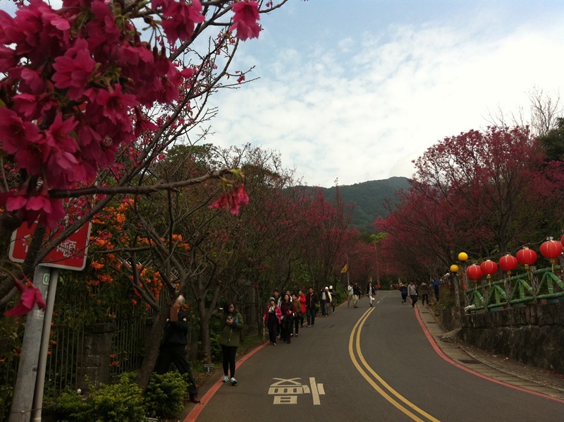 舒適的大屯里櫻花隧道,已有賞花車與賞花客留連拜訪了, 可花況是真的沒有去年的繁華熱鬧。天氣溫暖晴朗, 大屯山上還有一片藍天, 沒得抱怨的。