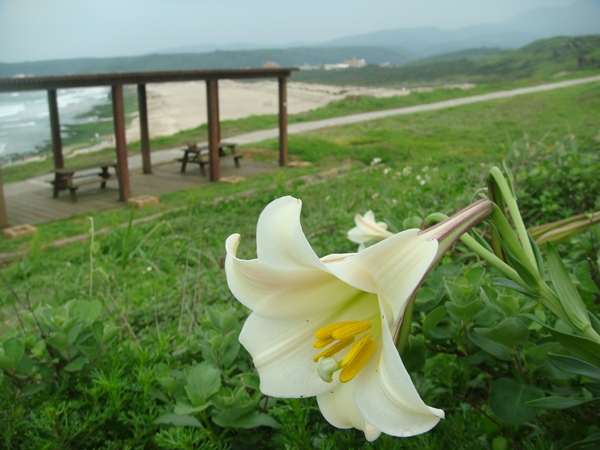 筱小姐的新文,與富貴角兩兩相望, 位於鄰近白沙灣風景區的 麟山鼻百合花況, 也差不多 , 只有沙灘上的野百合短短的莖桿,楚楚可人. 勇敢的支起花苞 漸漸開放了, 惹人憐愛. 沙灘上的野百合.