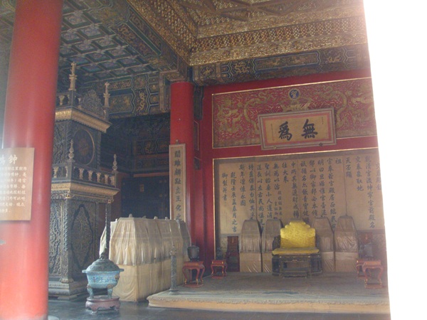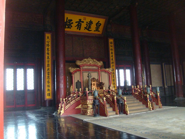 太和殿內不能進去, 只能遠遠看著象徵最高權位的 八條龍所雕成的金鑾殿龍椅 (加上皇帝自己一條龍即成九五之尊).