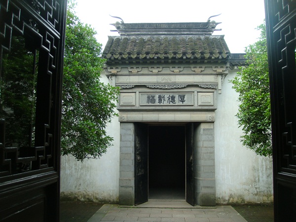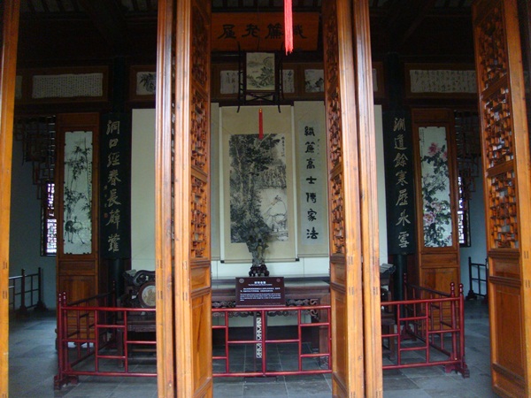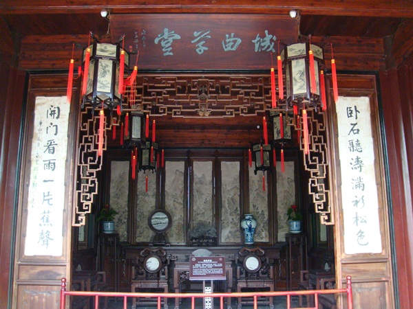 經過小小的門廳 掛著偕隱雙山匾額的轎廳, 穿過有一口水井的平泉小隱, 厚德載福小院, 詩酒聯歡院門, 到了 宴客大廳 "載酒堂". 堂名取宋人"東園載酒西園醉"詩意.