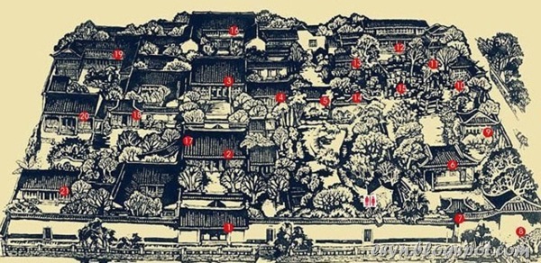 1.門樓 2.轎廳 3.载酒堂 4.群賢堂 5.無俗韵軒 6.山水間 7.魁星閣 8.聽橹楼 9.吾爱亭 10.望月亭 11.双照楼 12.城曲草堂 13.藤花舫 14.樨廊 15.黄石假山 16.楼大廳 17.鹤寿亭 18.方亭 19.藏書楼 20.織簾21.長方亭