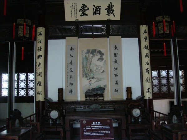 詩酒聯歡 ? 客廳既名 載酒堂 , "東園載酒西園歸 南陌尋花北陌歸", 擺明了要大家盡興耍玩.也不能儘玩, 左右長聯各寫著:"左壁觀圖右壁觀史 ; 西澗種柳東澗種松" 能這麼豪興大發 舞文弄墨的, 也只有文人庭園了.
