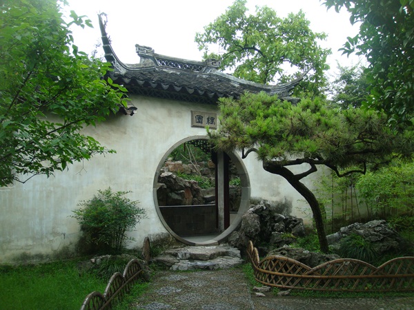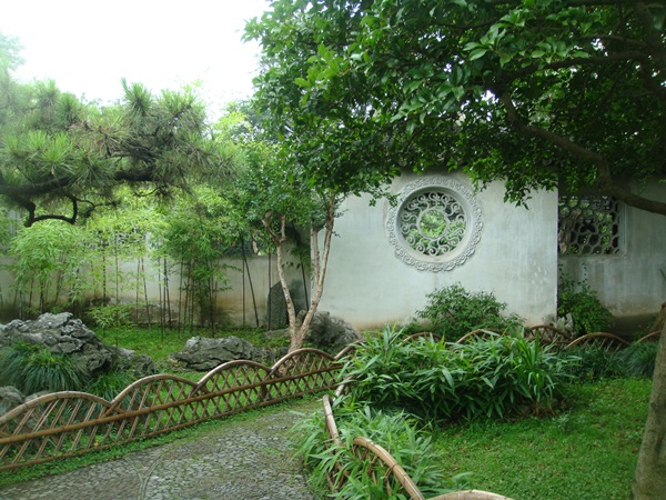 東西兩園院落之中的竹篁青松與白粉牆 洞門 圓漏窗相映, 甚是清美.