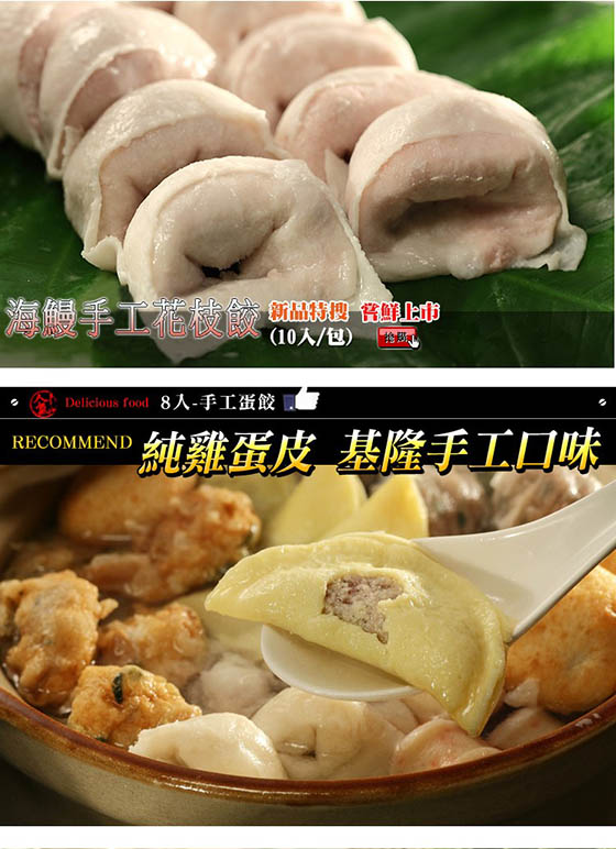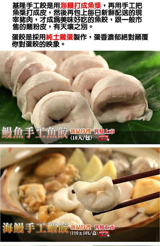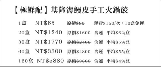 商品訊息簡述: 平均每盒最低只要49元起即可購得【極鮮配】基隆海鰻皮手工火鍋餃1盒/20盒/30盒/60盒/120盒,口味:蛋餃/魚餃/蝦餃/花枝餃;購滿10盒免運。
