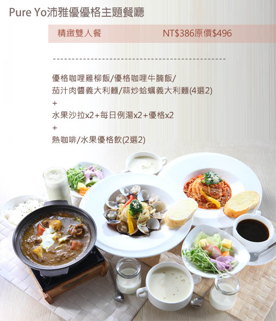 商品訊息簡述: 只要386元(雙人價)即可享用【Pure Yo沛雅優優格主題餐廳】原價496元精緻雙人餐:優格咖哩雞柳飯/優格咖哩牛腩飯/茄汁肉醬義大利麵/蒜炒蛤蠣義大利麵(主餐4選2)+水果沙拉x2+每日例湯x2+優格x2+熱咖啡/水果優格飲(飲品2選2)。