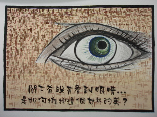 之所以選擇呈現一隻眼睛,因為我認為,一切萬物的開始都是來自於人類的靈魂之窗,上帝賦予達文西一雙眼睛,使他得以透過雙眼,開始和外界有了接觸,並且藉由敏銳的觀察力和洞察力,將大自然的事物與現實結合,以其豐富充沛的想像力,創造了許多富有巧思的作品,就像影片裡的一句話:「閣下有沒有看到眼睛,是如何擁抱這個世界的美?」我相信,在達文西的眼裡,任何生命的存在都有其特殊的意義,也許是一個女孩的頻笑、一雙乞憐的手,亦或是水的漣漪、光影的變動……,因為透過雙眼,才開始懂得欣賞美、了解感動是什麼,也才能結合他的聰明才智,創造出許多永恆的、絕世的、令人屏息的美,締造種種不朽的傳奇故事。