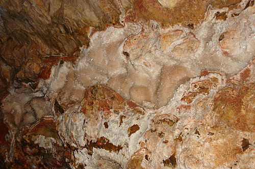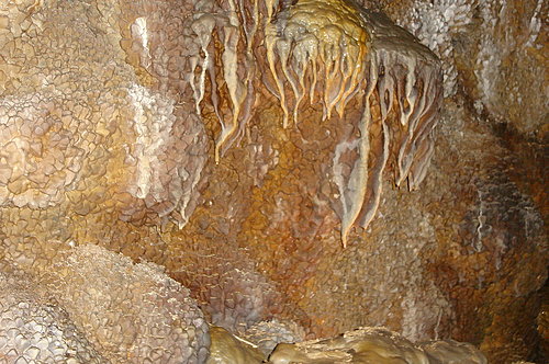 由於通道附近的岩石崩裂,所以相當多地方都可以清楚看見結晶岩層的截面,感覺起來這座洞穴的結晶岩層並不牢固,有許多地方都崩落了。而風洞隨處看得到的Boxwork結構,在這裏卻非常少見,在導覽的行程中僅僅只有唯一的一處。