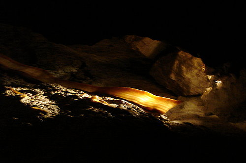 在接近行程的終點,導覽人員賣關子說要帶我們看一個特別的結構,看起來像是一條培根喔!說得如此生動,害我的肚子都咕嚕咕嚕作響。哇!真的耶!顏色形狀都好美喔!它有大概兩公尺長,就鑲嵌在岩壁上。