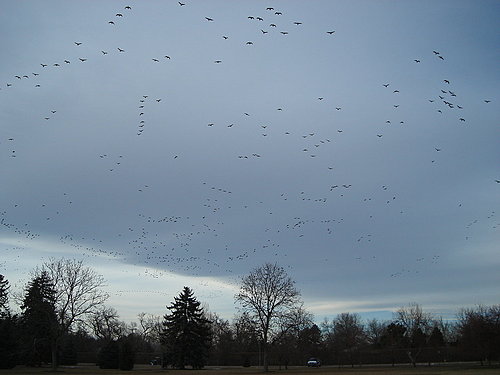 〝你看!〞我指著前方,雁鴨們已經開始組隊排成一排,規矩地從結冰的湖面走上草皮,也阻斷了我們前進的路。偷偷地…偷偷地…我們接近中…但牠們好精明喔!一下子就鳥獸散了。