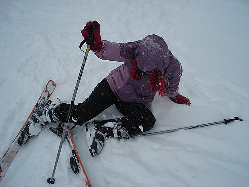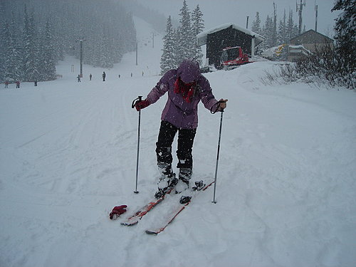 穿上裝備的我儼然像是個殘障人士,雖然杵著柺杖,但還是滑沒幾步就摔跤,連旁邊的小朋友都問我〝Are you OK?!〞真是夠丟臉的。真該慶幸當時正下著大雪,不然幾番跌坐雪地上的屁股肯定受不了。