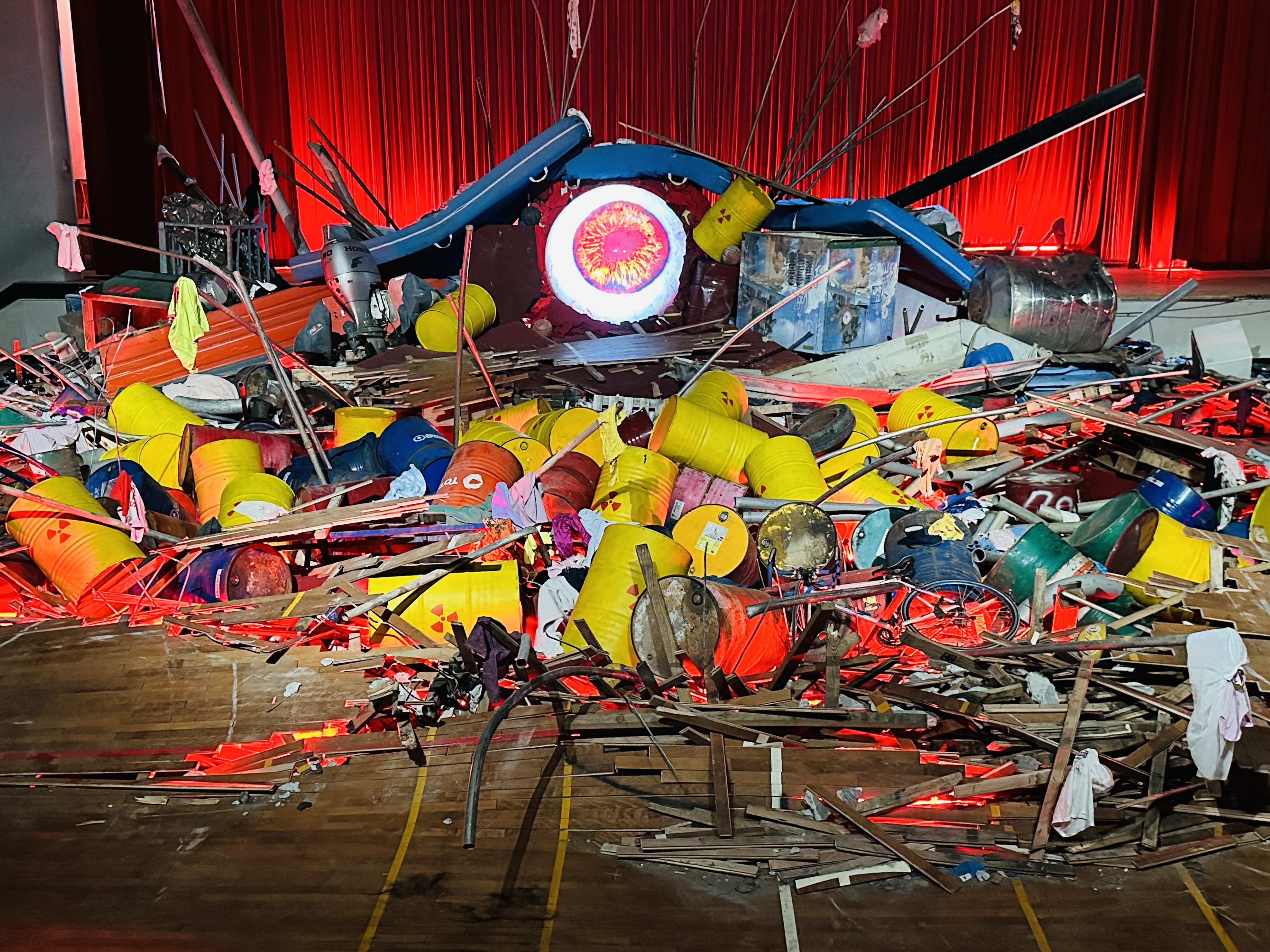 作品中不斷投映原子彈爆炸的影像與迴盪的聲響,提醒著人類:科技與力量既能保護,也能摧毀