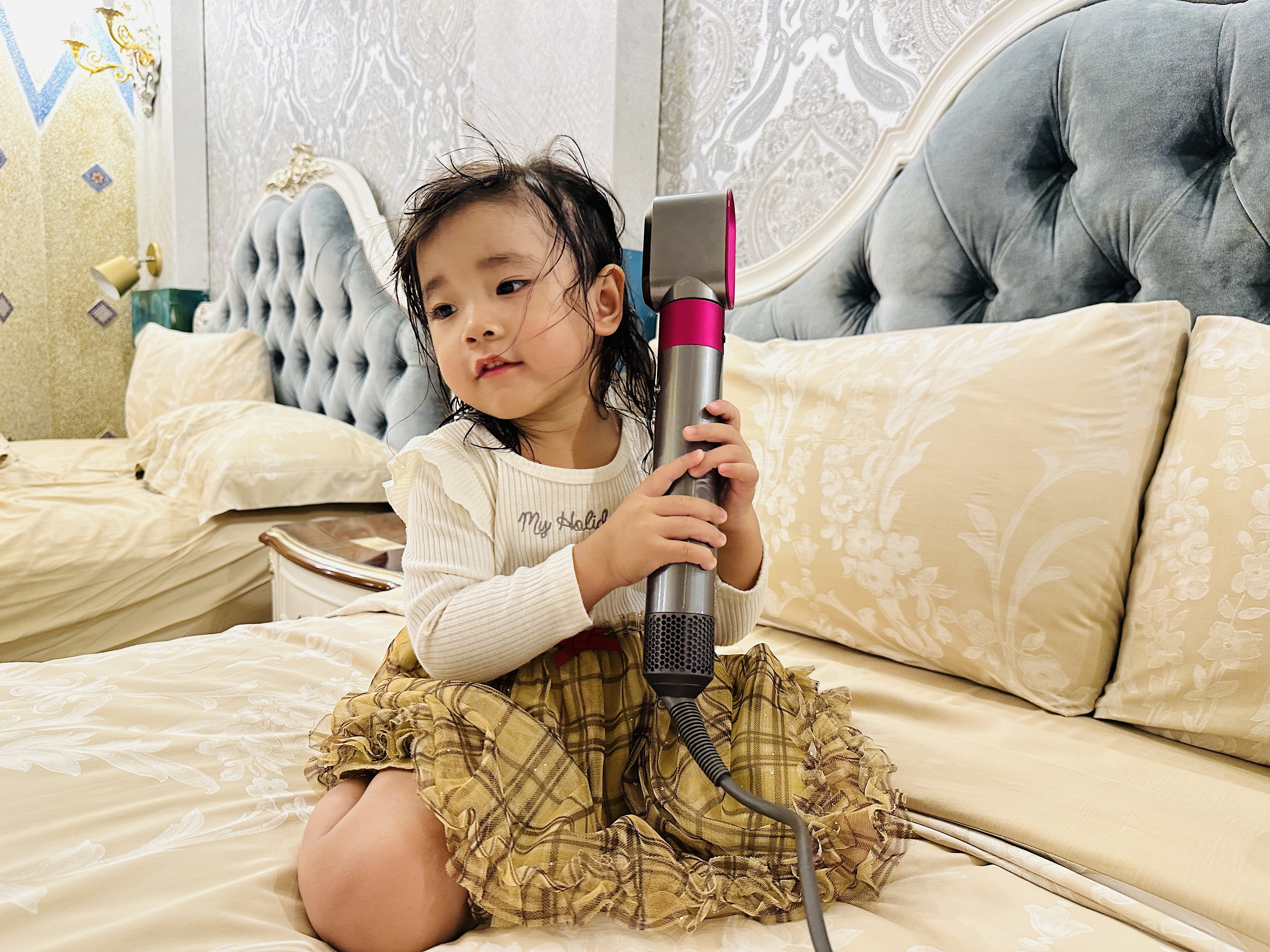 Dyson 吹風機與整髮器讓人驚喜,吹完頭髮真的柔順許多,紜紜也能輕鬆自如地自己吹頭髮。