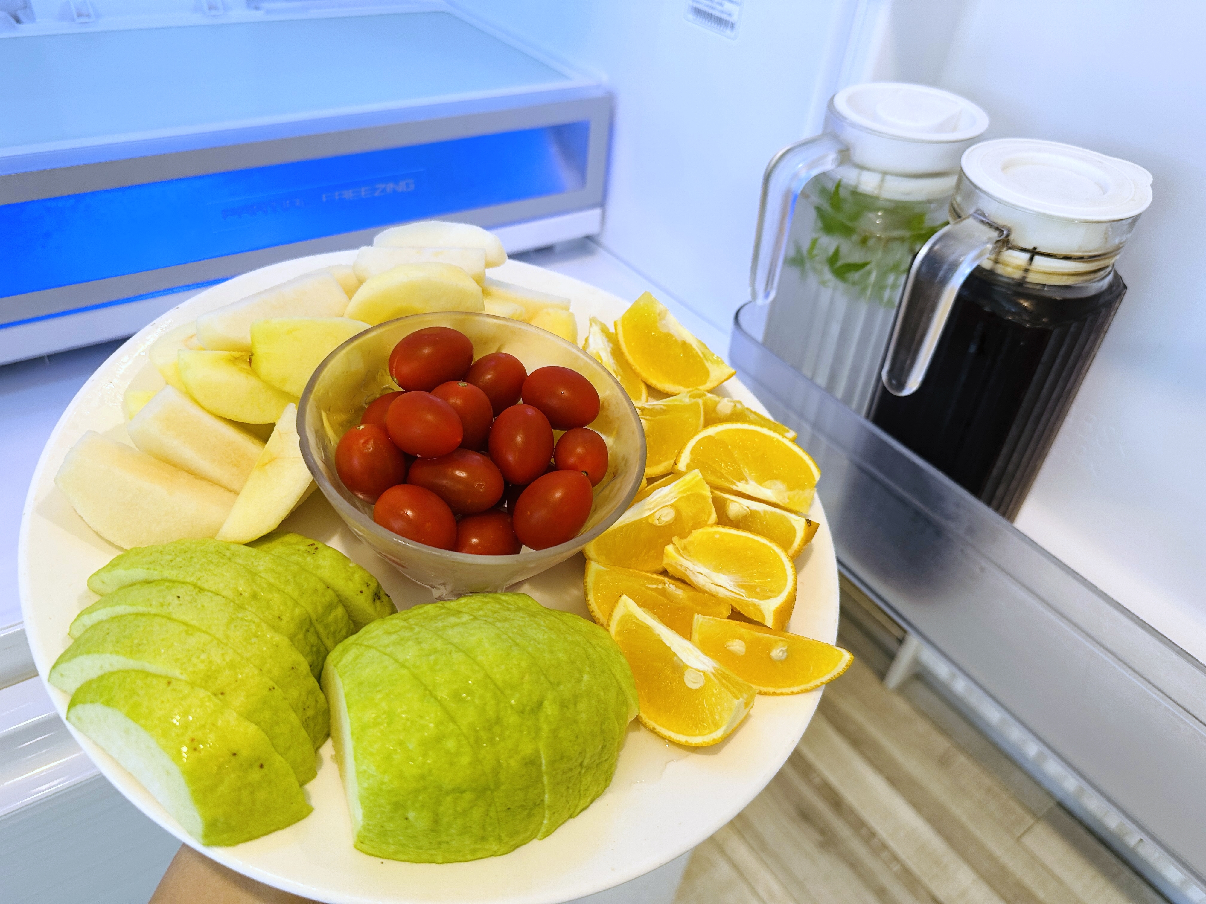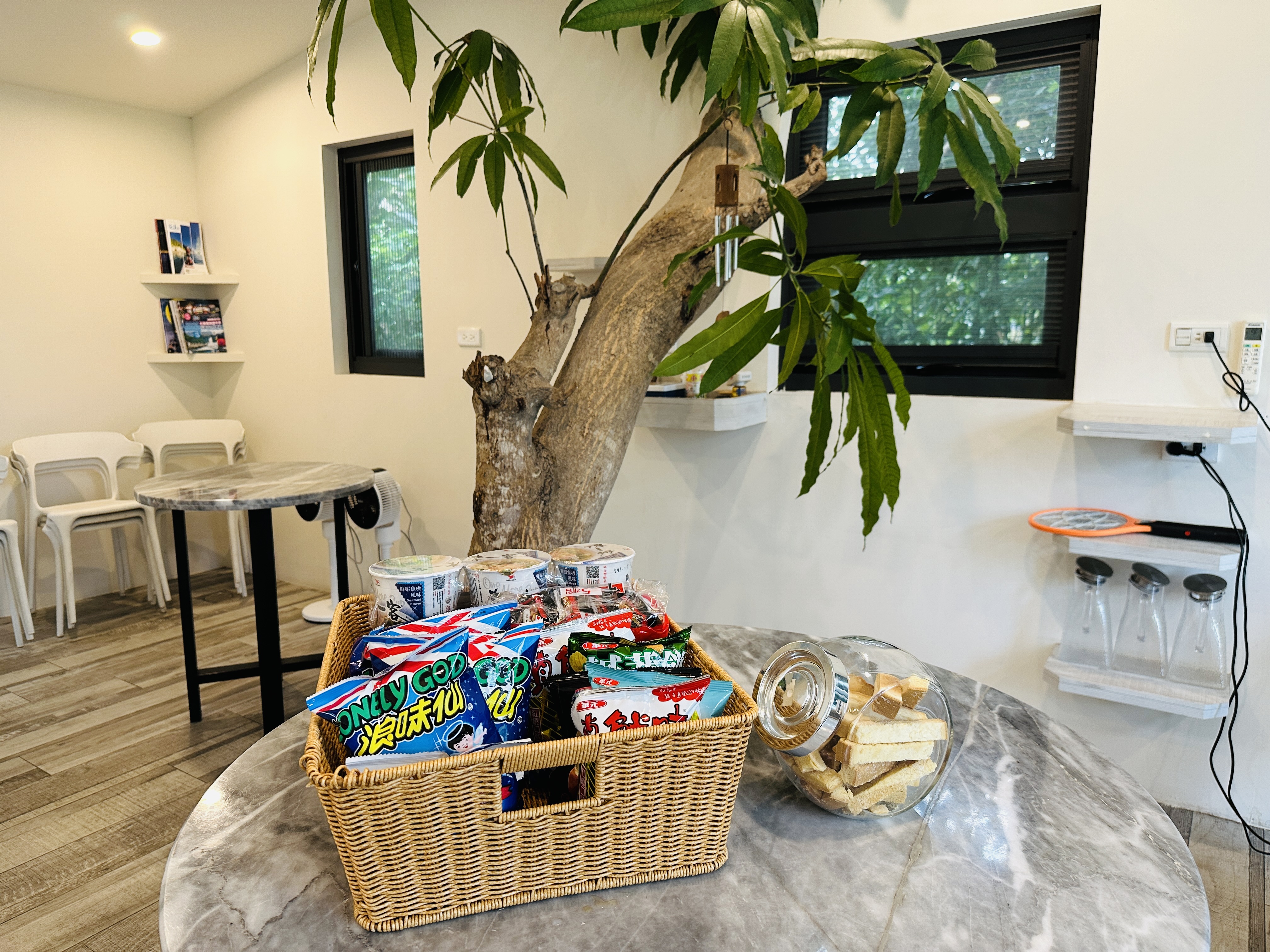 管家對包棟客人也真的很貼心,早就幫我們準備好餅乾、泡麵,還有在地的花蓮奶油酥條、水果切盤和各式飲品。玩到一半肚子餓,完全不用再外出找東西吃,這種被照顧好的感覺真的很加分。