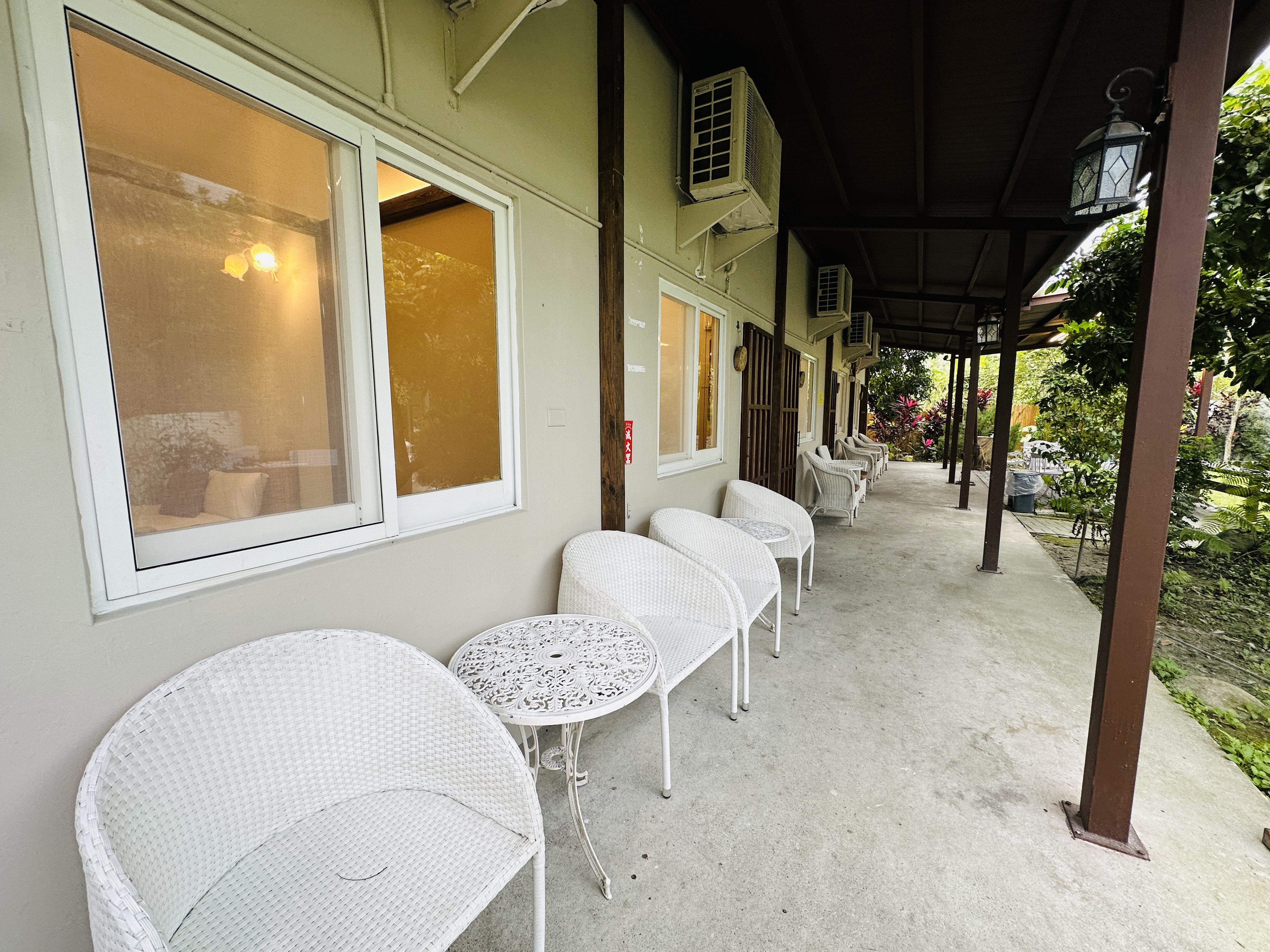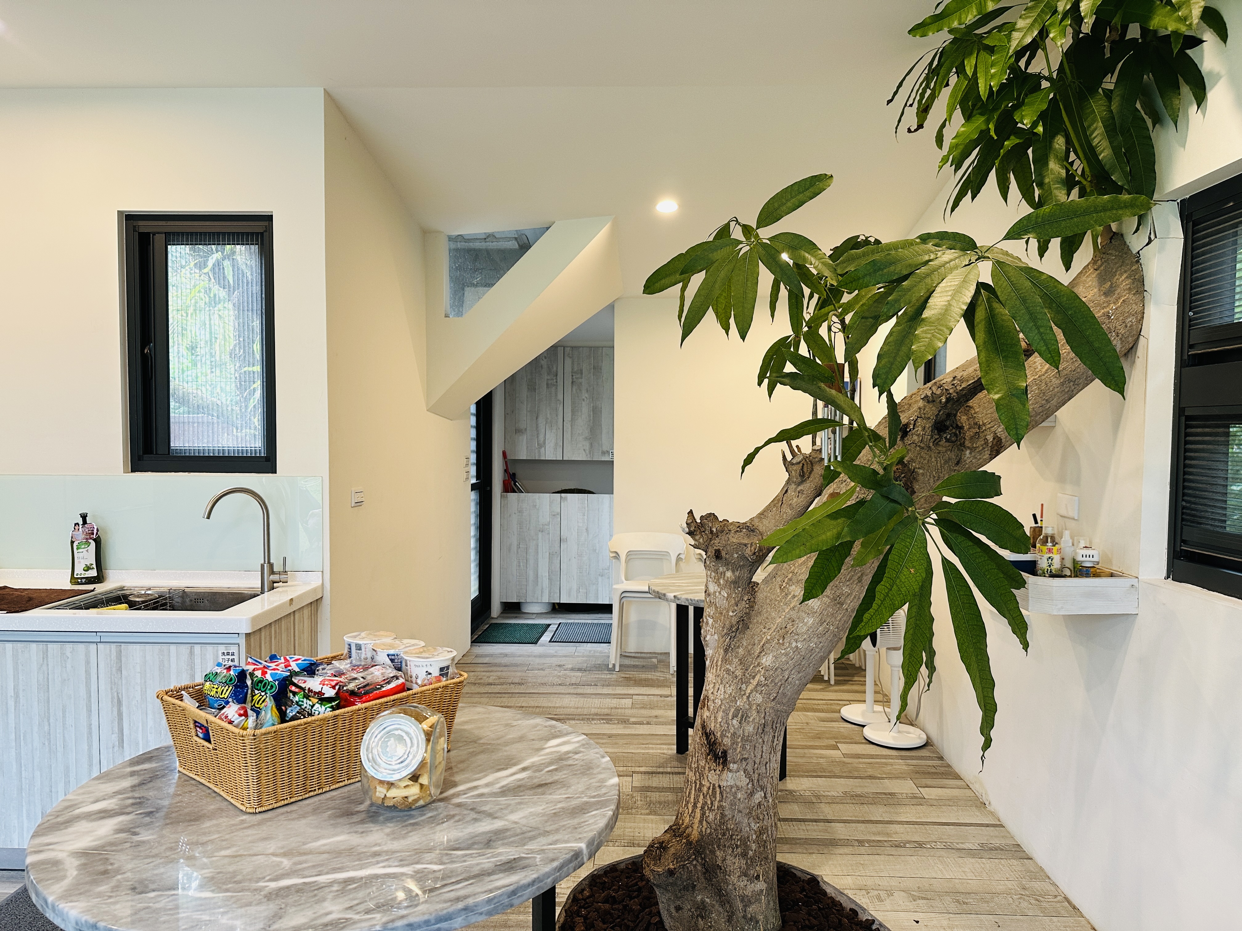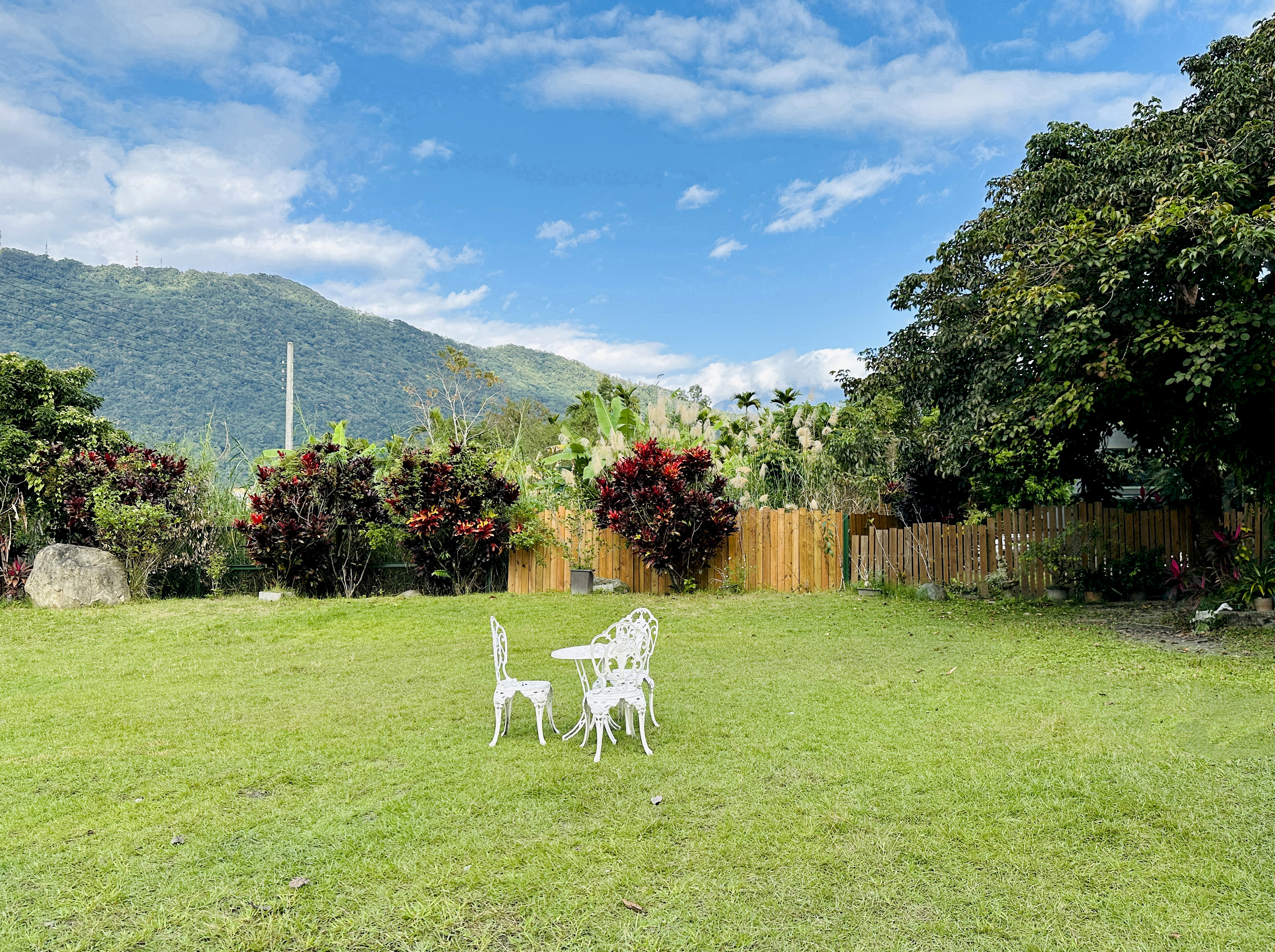 住宿區氛圍就比較偏向放鬆、靜靜休息的感覺,戶外有座位可以坐著聊天,整體的綠意造景讓人一走進來就覺得很自在。民宿也有提供免費腳踏車,住客可以騎到附近晃晃,感受一下花蓮的慢步調。